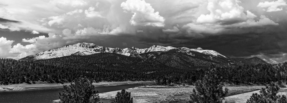 "Pikes Peak or Bust" captures the iconic essence of America's Mountain, standing tall at 14,110 feet above sea level. This striking black-and-white composition invites viewers to explore the dramatic interplay of light and shadow across the rugged terrain. The swirling clouds above hint at the stories of adventure and inspiration that have echoed through the ages, reminding us of the beauty that inspired "America the Beautiful."